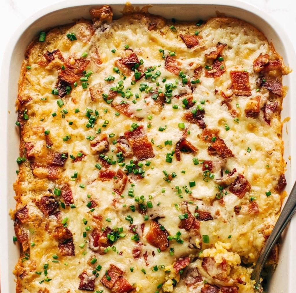 Pour into prepared casserole dish and bake for 35 minutes. Remove from oven and sprinkle the shredded cheese and remaining bacon over the top. Return to the oven and cook for an additional 5 minutes or until cheese is completely melted. Remove from oven and sprinkle with fresh chives (if desired).